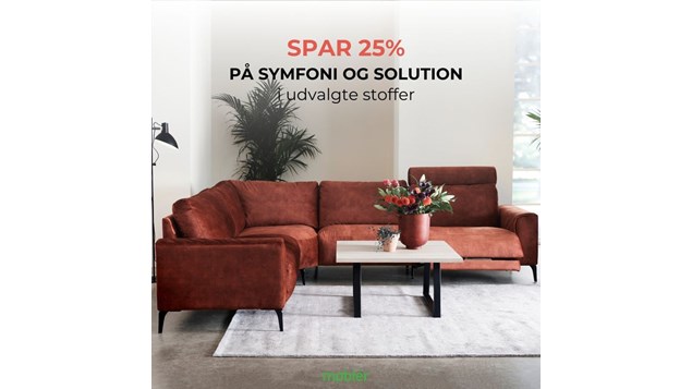 Lige nu kan du spare 25% på vores alsidige Symfoni og Solution sofaer i udvalgte stoffer. Tag et kig i vores kampagnekatalog www.mobler.dk/kampagner eller besøg vores butik, hvor vi vil guide dig til den perfekte sofa