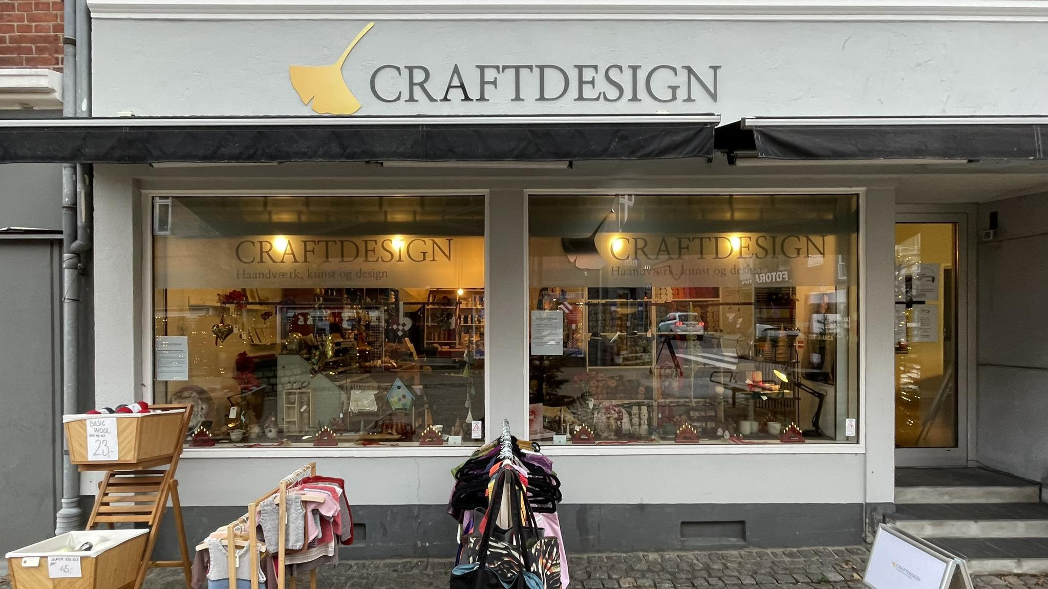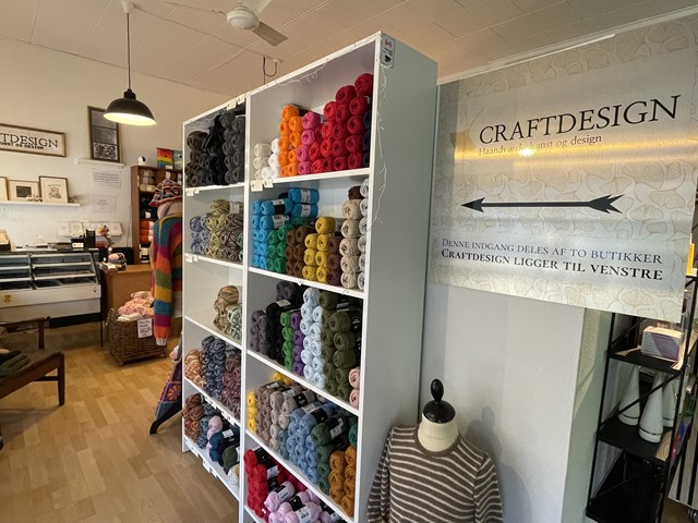 Overfor Matas på gågaden finder du Craftdesign, der deler lokale med en anden lokal forretning. Her har kreativitet, håndværk og kunst fået en central plads i en butik, hvor både garn og unikke værker fra kunstnere fylder hylderne.